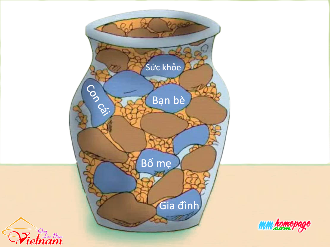 Hãy quan tâm đến những hòn đá trước tiên. Hãy ưu tiên đặt chúng vào bình. Những điều còn lại chỉ là cát .